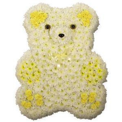 Aranjament floral in forma de ursulet din crizantema cu o inaltime de aproximativ 40 cm