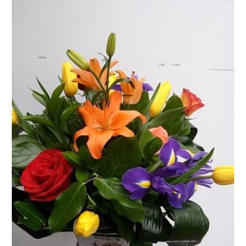 Buchet din 3 fire trandafiri 6 fire lalele iris si plante exotice