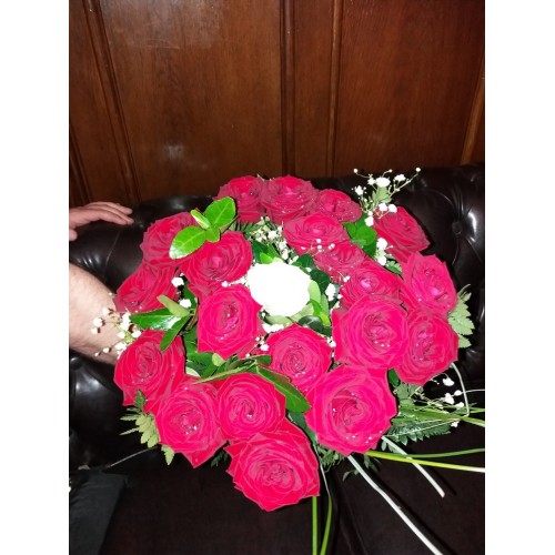 Buchet din 21 fire trandafiri cu gypsophila si plante