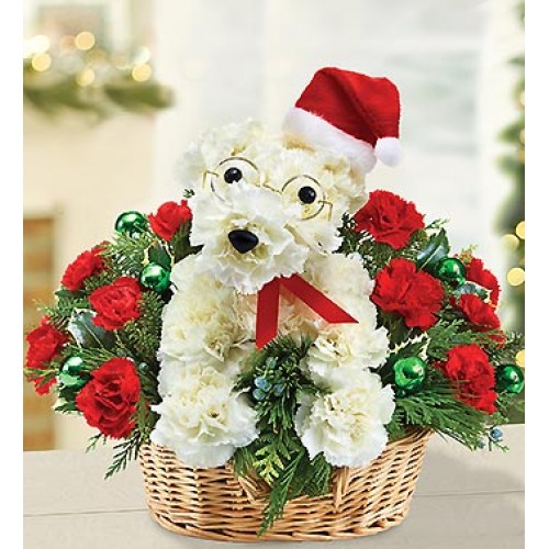 Aranjament in cos dre ratan cu un catel din garoafe sau crizanteme, Â garoafe, brad si globuri.